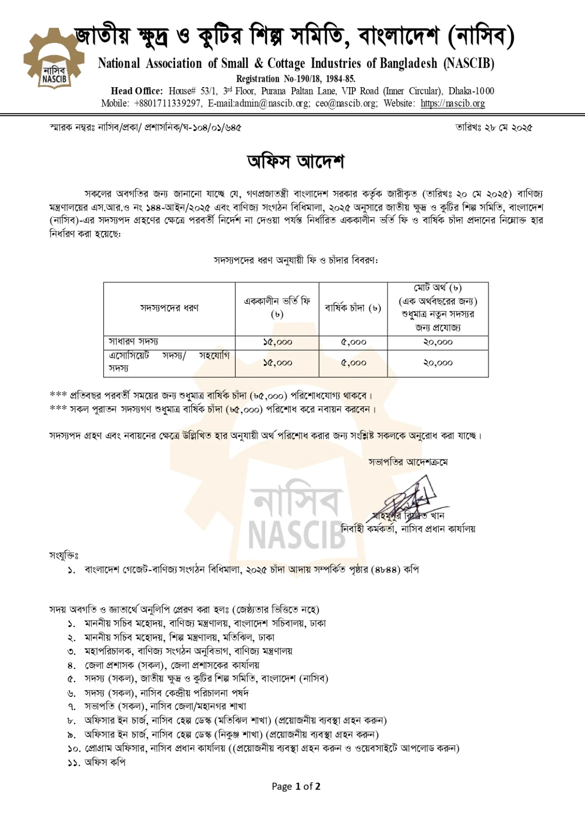 নতুন মেম্বারশিপ ফি সংক্রান্ত অফিস আদেশ